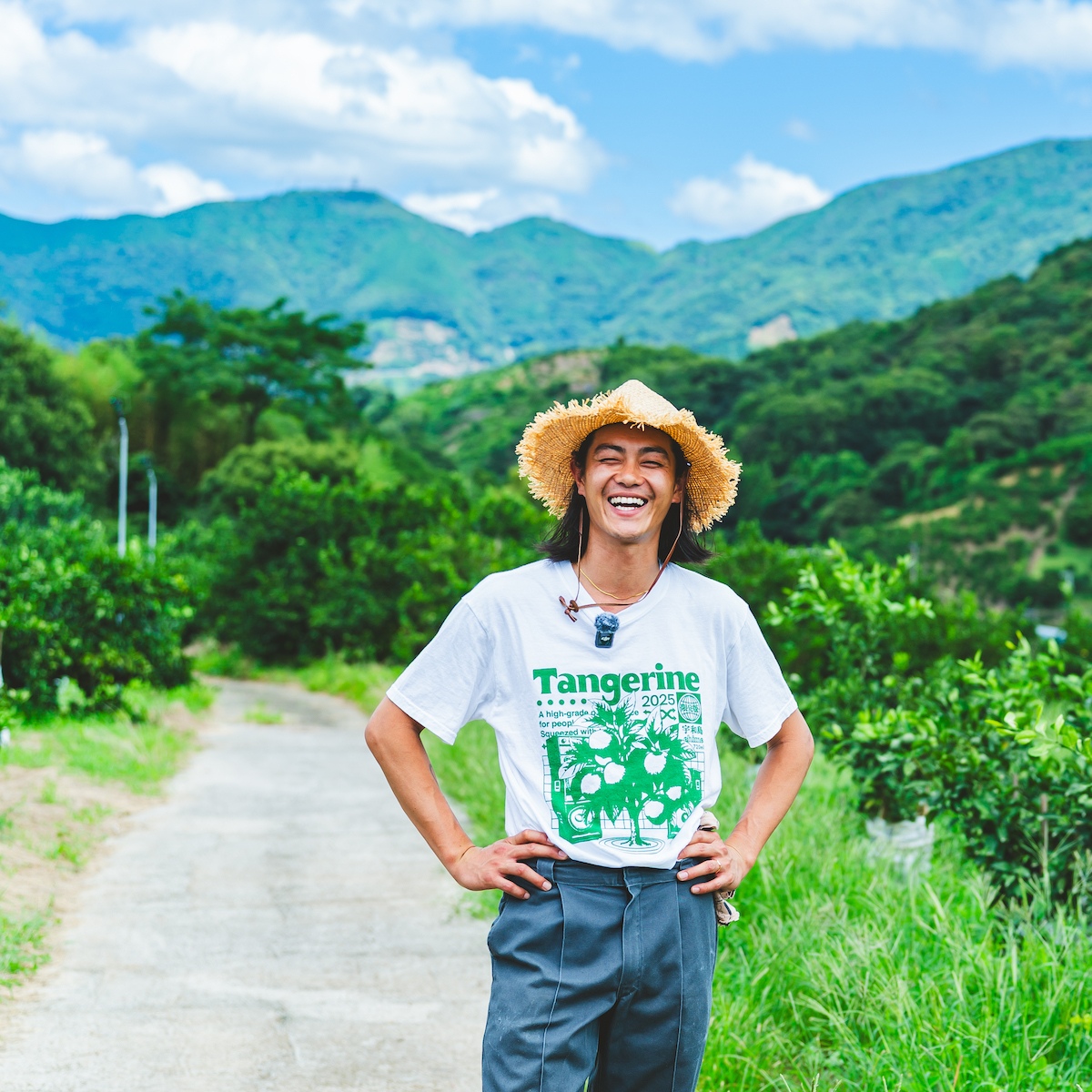 愛媛県宇和島市出身。大学進学を機に千葉県に移住。大学で観光を学ぶ中で、宇和島市の魅力について再認識する。農業を営みながら、自家農園のみかんを使ったジュースや、自身がデザインしたTシャツやグッズを扱ったブランド〈Tangerine〉を展開中。将来は、飲食や宿泊事業も視野に入れ、宇和島産柑橘のPRをするため積極的に活動を行っている。