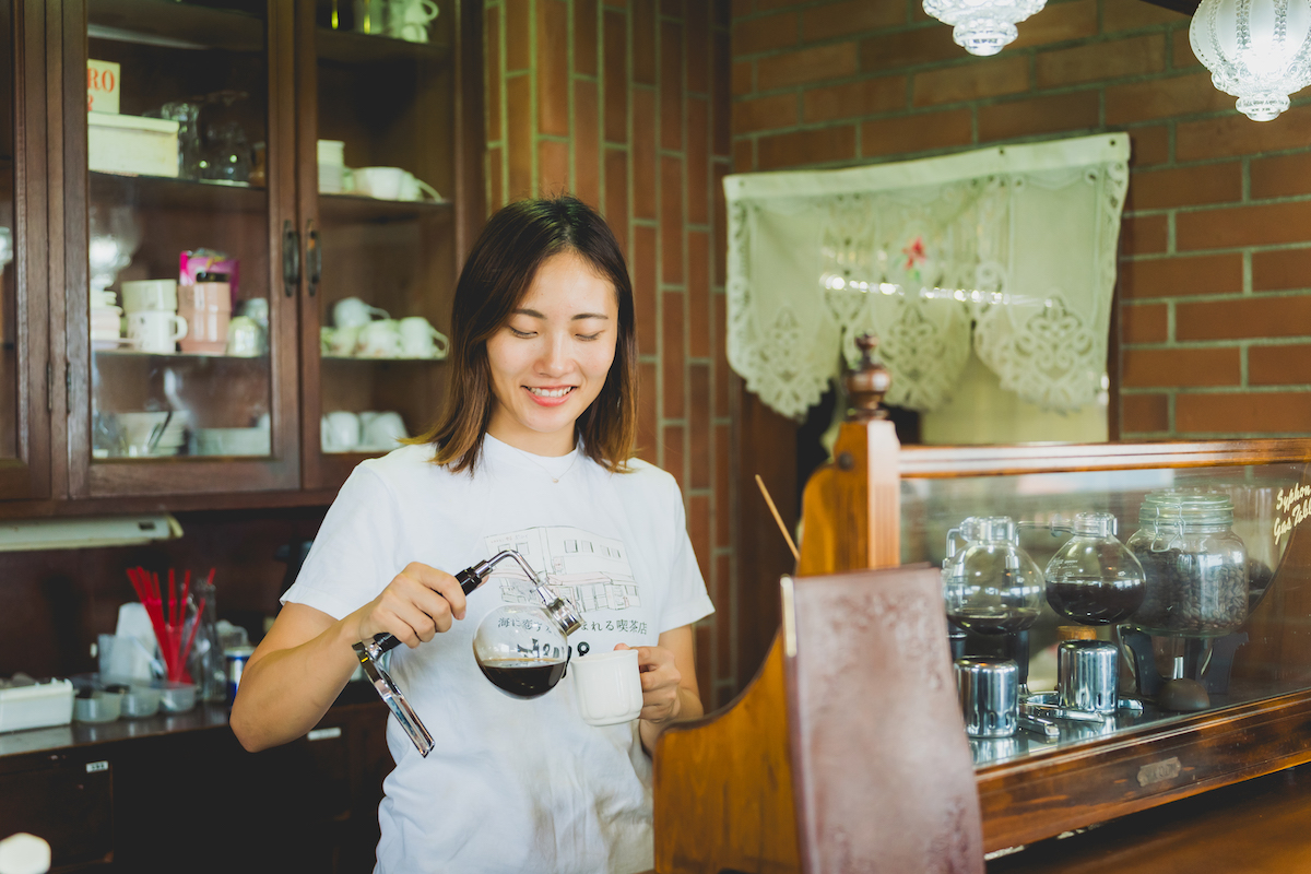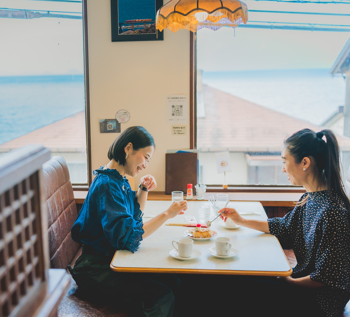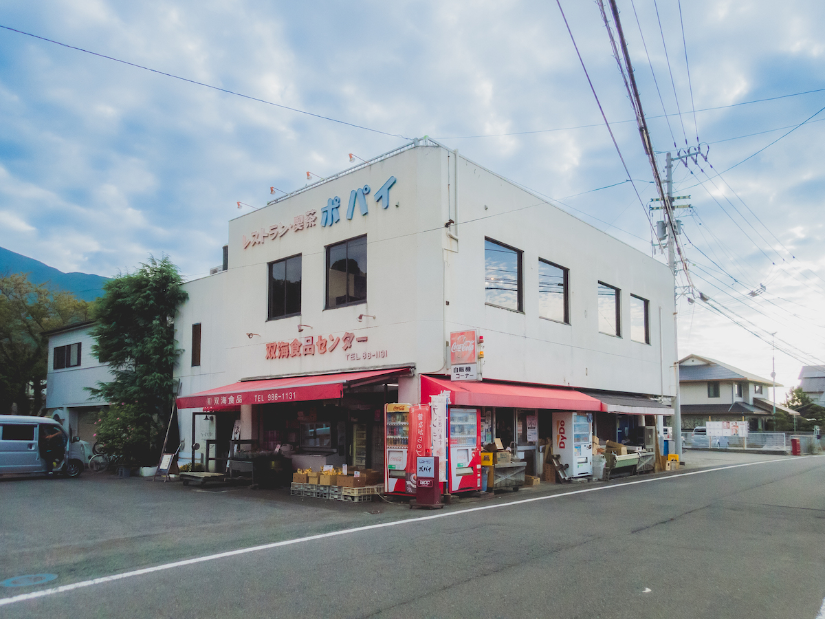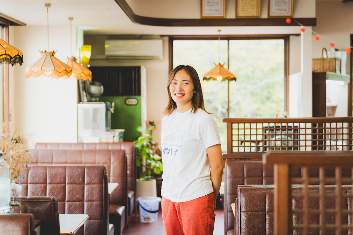 大学4年生の時、地域おこし協力隊として双海に移住し、喫茶店とゲストハウスの準備を着々と進行。そして、2021年に念願の復活オープン! 祖父母時代の人気メニュー、ポパイ秘伝の中華そばを引き継ぎ、硬めのプリンやサイフォンで入れる珈琲など、空間もメニューもどこか懐かしい、レトロ要素が溢れてます。さらに、2022年にはゲストハウス部分もオープン!ちなみに、1階の食品店は上田さんの祖父母が現役で運営。孫と一緒にお店番なんて、素敵。